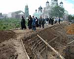 Царские дни в Екатеринбурге В сентябре 2000 года, через месяц после Юбилейного Архиерейского собора, на котором были прославлены император Николай II и его семья, Патриарх Алексий побывал с пастырским визитом на Урале. В это время уже начались строительные работы на пустыре, где когда-то стоял Ипатьевский дом и где произошла трагедия, которую теперь часто называют “уральской Голгофой”. Патриарх Алексий и архиепископ Екатеринбургский и Верхотурский Викентий подписали памятную грамоту об основании храма Всех Святых, и она была заложена в основание будущего пятикупольного собора (на фото слева). Прошло чуть менее трех лет. Те, кто отправятся на Царские Дни 2003 года в Екатеринбург, увидят Храм-на-Крови таким, как на фото внизу. Внешняя отделка полностью завершена, в эти дни монтируют иконостас. На снимке слева: здание патриаршей резиденции, которое входит в один архитектурный комплекс с Всехсвятским собором.